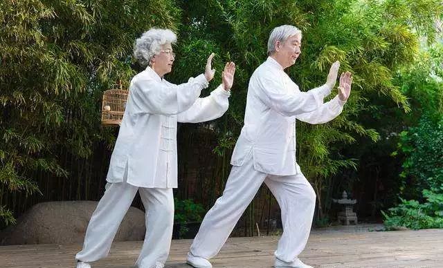 正在和其他老人们一起做健康操