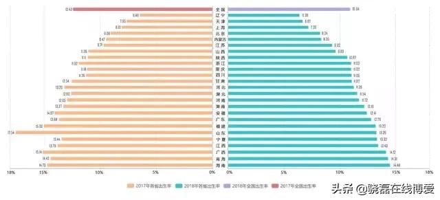 根据出生率排行榜,我们可知,与2017年相比,全国人口出生率仅为10.94‰,下降1.49‰,2018年各省新生儿出生率也均呈下降趋势,这在一定程度上促使老年人口占比增加,人口老龄化程度加重。